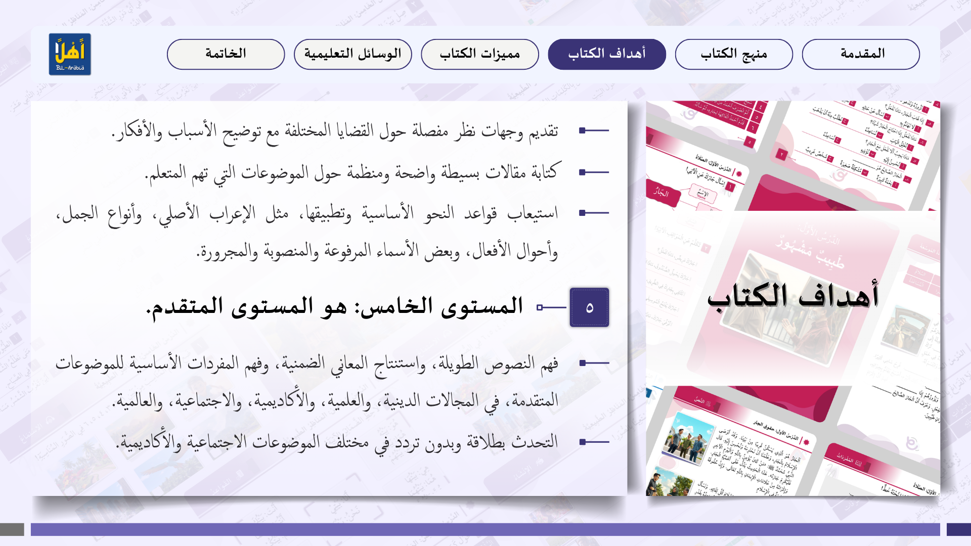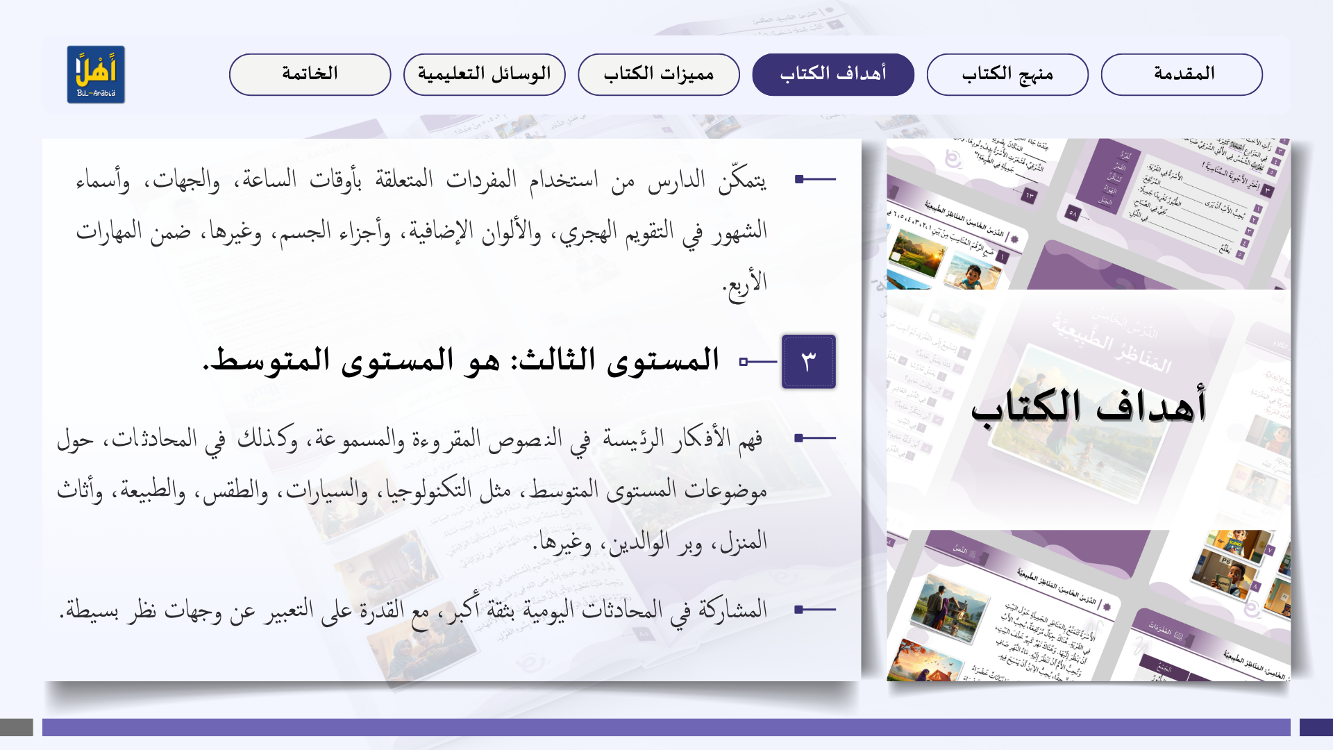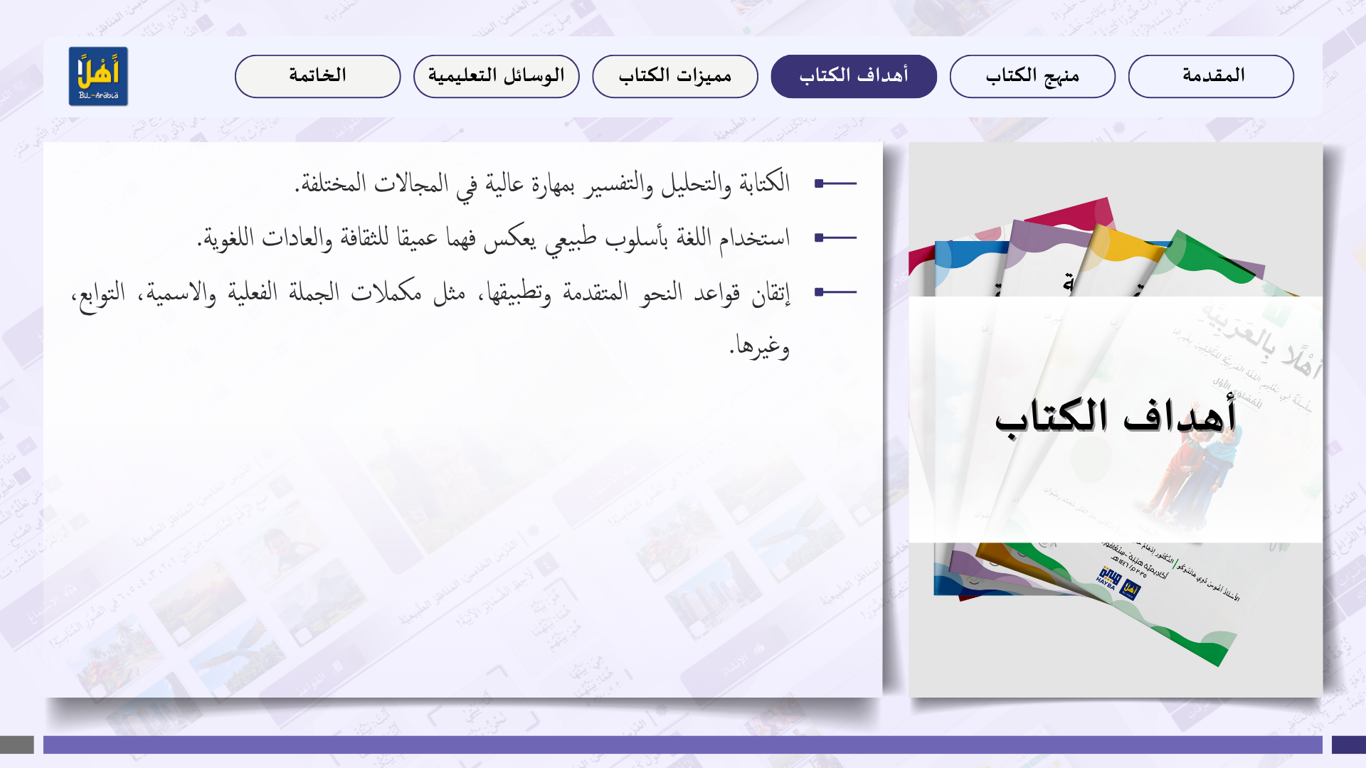 التعريف بمنهج سلسلة ” أهلا بالعربية”، وأهدافا، ومميزاتها، ووسائلها التعليمية مفصلا